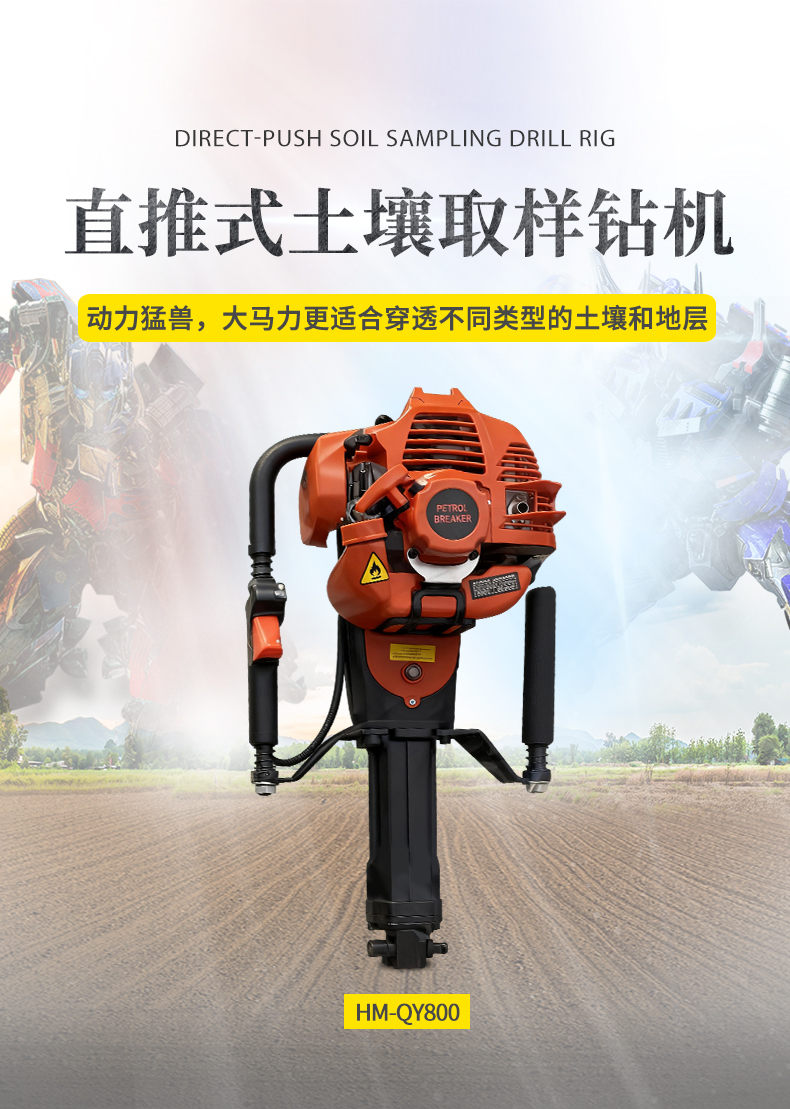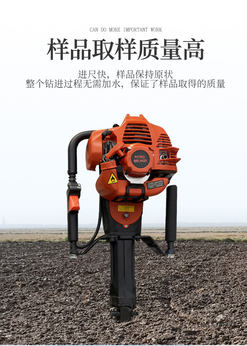 HM-QY800單人手持式土壤取樣鉆機(jī)是在參考大型液壓、汽油、氣動鉆機(jī)的基礎(chǔ)上設(shè)計(jì)的一款輕便的土壤采集鉆機(jī)。即使沒有操作經(jīng)驗(yàn)的鉆探人員,簡單培訓(xùn)就可操作。取樣過程及其簡單,1到2個(gè)人即可完成設(shè)備的操作。整個(gè)鉆進(jìn)過程無需加水,保證了樣品取得的質(zhì)量(無污染、無擾動)。