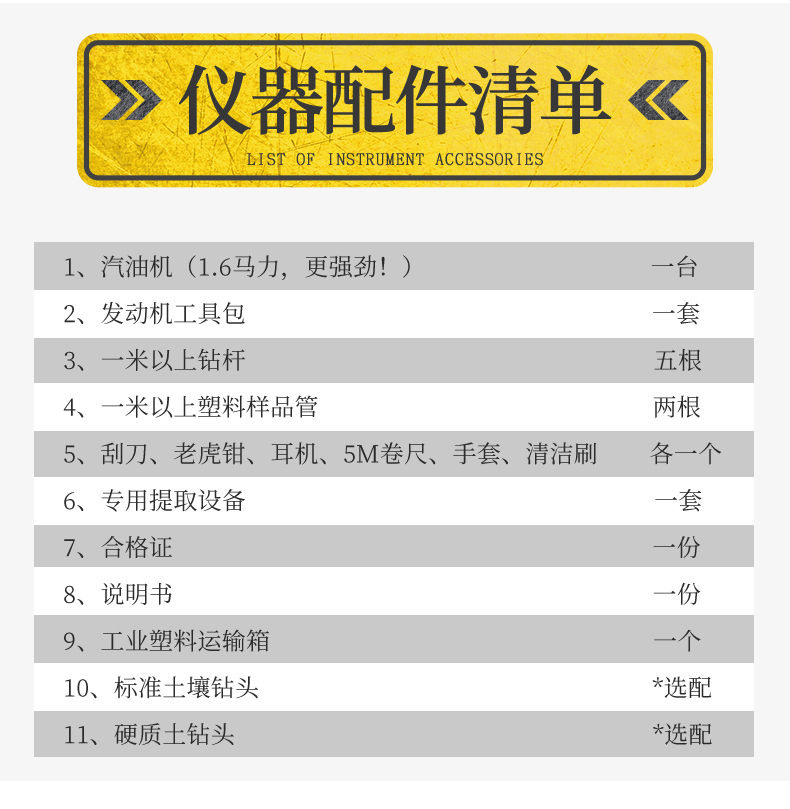 汽油動力發(fā)動機(jī)一臺,發(fā)動機(jī)工具包一套,標(biāo)準(zhǔn)土壤鉆頭、硬質(zhì)土鉆頭隨意選配,不小于1米的鉆桿5根、不小于1米的塑料樣品管2根,刮刀、老虎鉗、耳機(jī)、5M卷尺、手套、清潔刷各1個(gè),專用提取設(shè)備1套、工業(yè)塑料運(yùn)輸箱1個(gè)