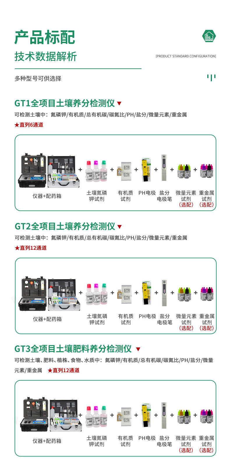 配套齊全:該儀器集藥、器、儀為一體,攜帶方便,相當于一個小型移動實驗室,無需用戶自配附件,亦可靈活野外流動測試。適于農業服務部門或農資經銷商、高教院校、科研院所、合作社、肥料廠商、大種植戶測土施肥和鑒別肥料真假及環保檢測應用。