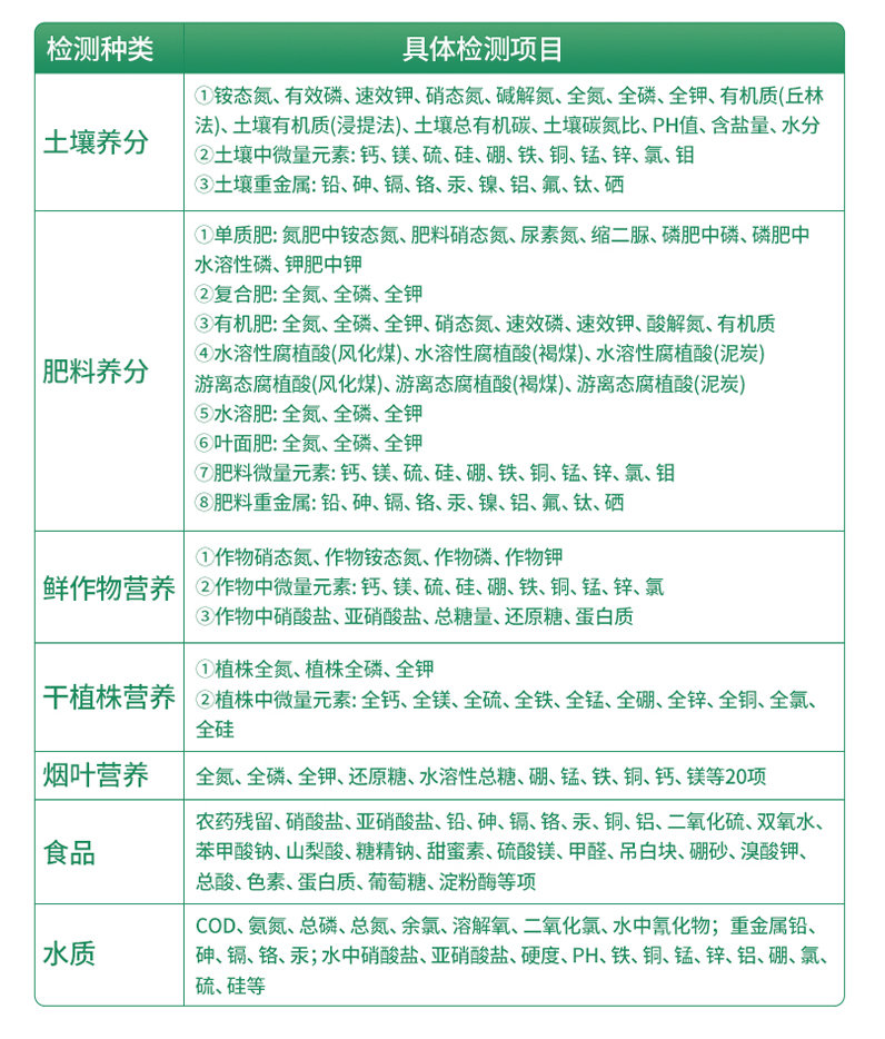 2、肥料養分:●單質肥:氮肥中銨態氮、肥料硝態氮、尿素氮、縮二脲、磷肥中磷、磷肥中水溶性磷、鉀肥中鉀;●復合肥全氮、復合肥全磷、復合肥全鉀;●有機肥全氮、有機肥全磷、有機肥全鉀、有機肥硝態氮、有機肥速效磷、有機肥速效鉀、有機肥酸解氮、有機質;●水溶性腐植酸(風化煤)、水溶性腐植酸(褐煤)、水溶性腐植酸(泥炭)、游離態腐植酸(風化煤)、游離態腐植酸(褐煤)、游離態腐植酸(泥炭);●水溶肥全氮、水溶肥全磷、水溶肥全鉀;●葉面肥全氮、葉面肥全磷、葉面肥全鉀;●各種肥料微量元素:肥料鈣、肥料鎂、肥料硫、肥料硅、肥料硼、肥料鐵、肥料銅、肥料錳、肥料鋅、肥料氯、肥料鉬;●肥料重金屬:肥料鉛、肥料砷、肥料鎘、肥料鉻、肥料汞、肥料鎳、肥料鋁、肥料氟、肥料鈦、肥料硒。